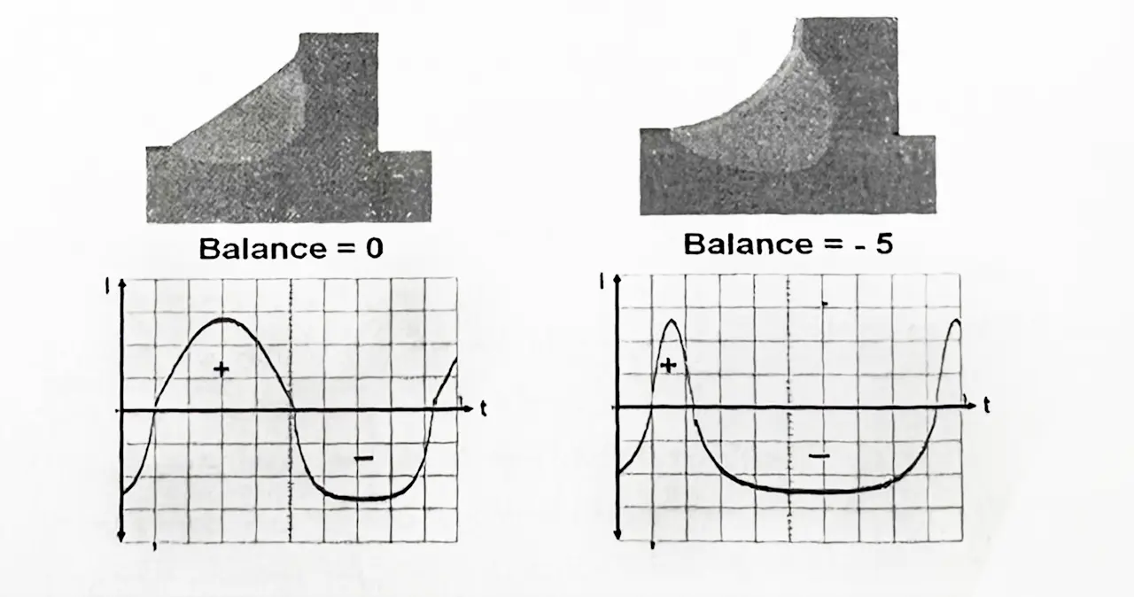 در شکل زیر، مقدار بالانس جریان AC را به میزان نیم سیکل مثبت ۵۵ درصد ونیم سیکل منفى ۴۵ درصد تنظیم مى گردد.