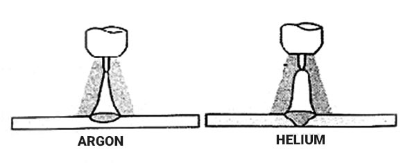 گاز هلیوم داراى هدایت حرارتى حدود ٩ برابر گاز آرگون و گاز هیدروژن (بصورت ملکولى) حدود ١١ برابر گاز آرگون مى باشند که موجب افزایش توان قوس در اثر افزایش انرژى یونیزاسیون قوس شده و جهت جوشکارى قطعات قطور و یا جوشکارى فلزات با هدایت حرارتى بالا مانند مس مناسب هستند که معمولا از هلیوم خالص جهت جوشکارى با روبات استفاده مى گردد. به دیاگرام هاى زیر دقت نمایید:
